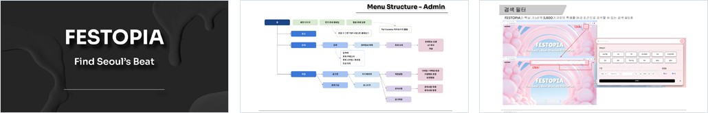 - 메인 : 인기 축제, 월별 축제 일정 (캘린더 라이브러리 사용) - 회원 : 스프링 시큐리티 활용하여 로그인/회원가입, 마이페이지 (찜 목록, 활동내역) - 공지사항 (관리자, 회원 구분하여 관리) - 축제 정보 : 공공데이터 API 사용하여 JSON 파싱, 검색 필터, 댓글 관련 로직, 정렬, 찜 목록 |